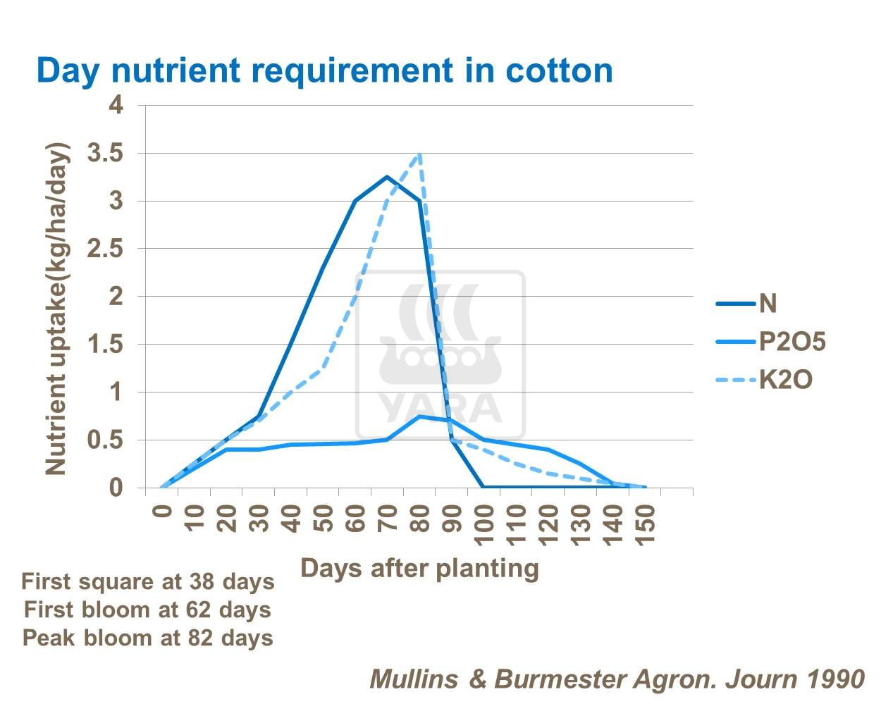 Nitrógeno prolonga la fase de crecimiento de la planta e incrementa el número de cápsulas cuajadas. Nitrógeno puede también incrementar el tamaño de las cápsulas (peso de semillas de algodón por cápsula). Este efecto es relativamente menor que el efecto en el número de cápsulas y ocurre normalmente a través de un incremento de peso individual de semillas a costa del porcentaje de pelusa.