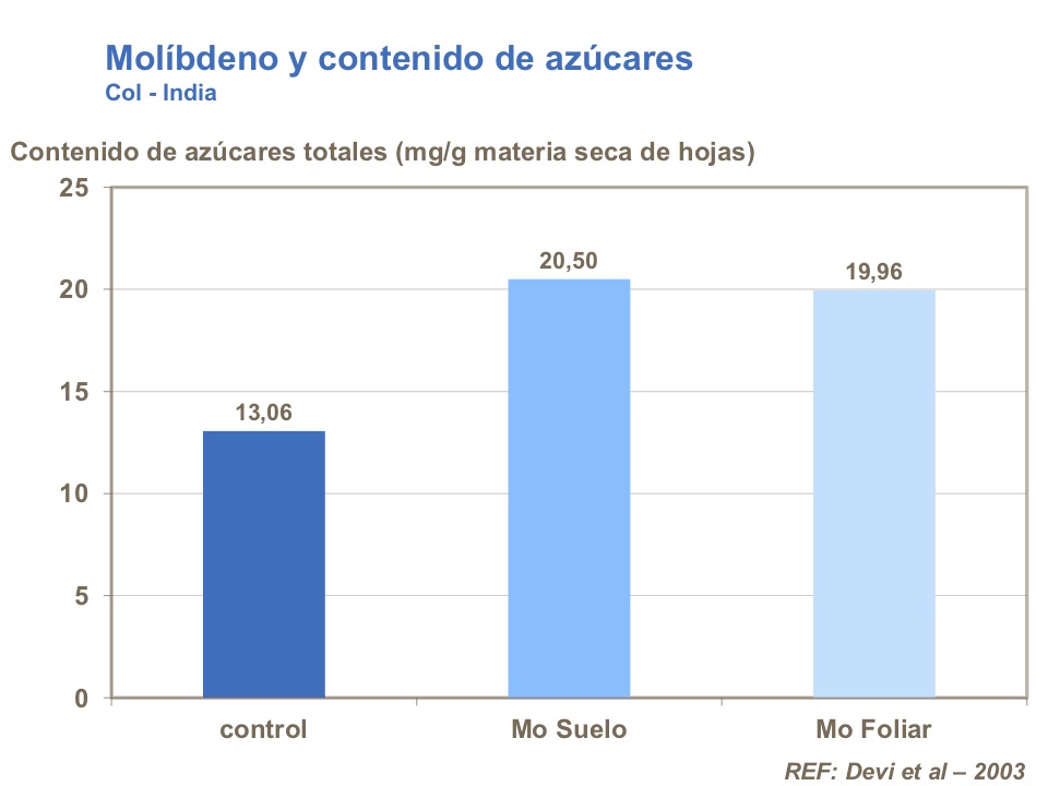 Molíbdeno y zinc también incrementan el contenido de azúcares. Disponible en cantidades suficientes, el zinc incrementa el contenido de azúcares en las hojas. El zinc establece complejos con proteínas y por eso es un elemento estructural y funcional de muchos enzimas. El uso excesivo de fósforo puede restringir la absorción de zinc. Por eso es importante con un aporte balanceado de zinc y fósforo.